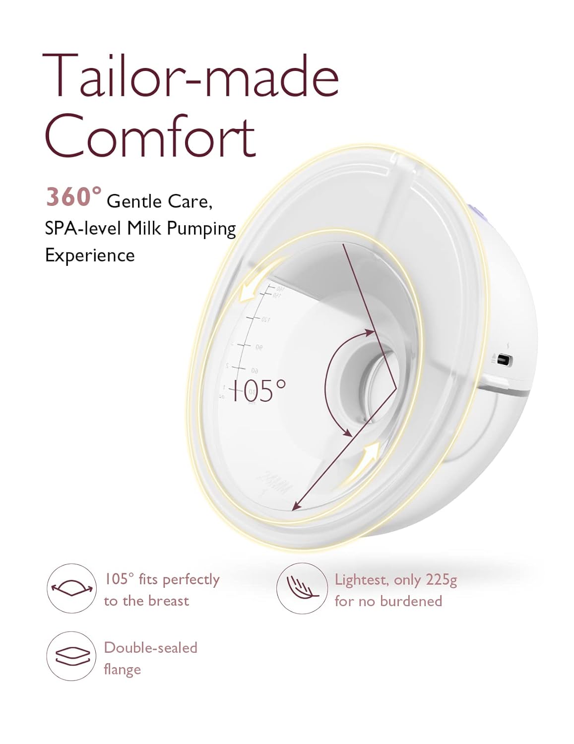 The M5’s “Baby Mouth” design mimics natural breastfeeding for gentler, more effective milk expression. Its double-sealed 24mm flange and ergonomic breast arc ensure a secure, comfortable fit, reducing leaks and improving overall pumping experience.